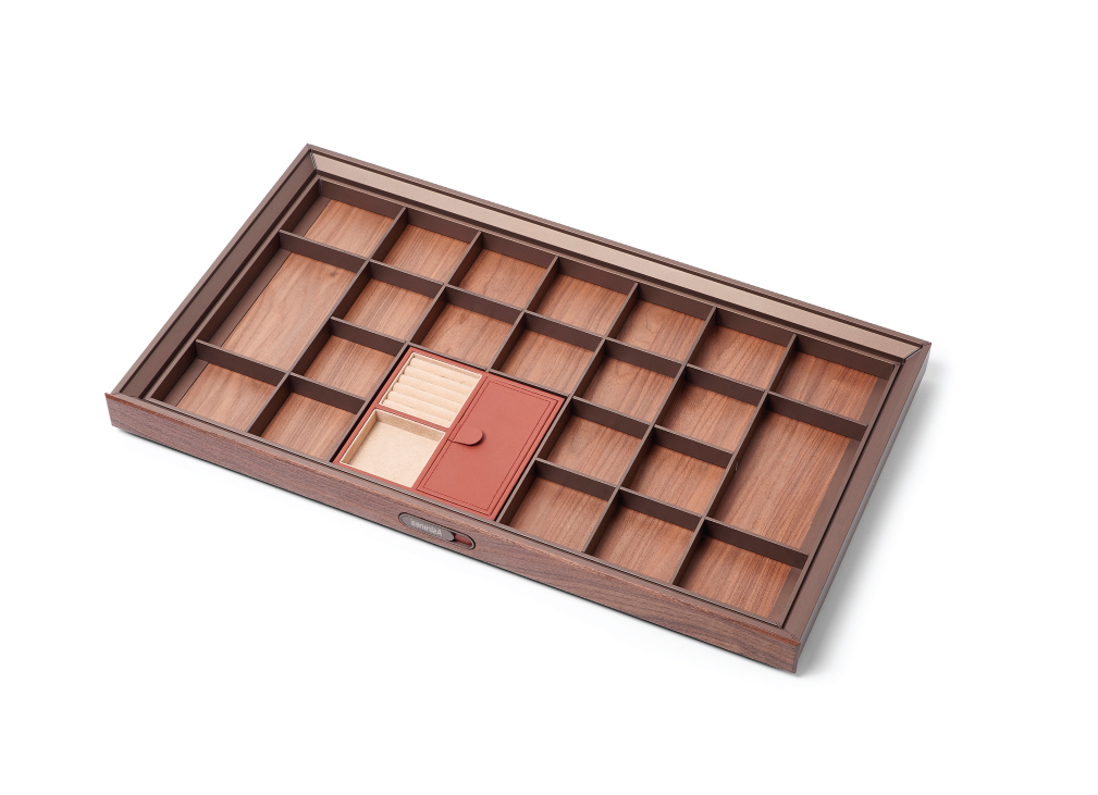 Smartly organize leather jewellary box, which can accommo- date a selection of storage elements for items that require special care and attention. The width of the frame is adjustable according to the internal wardrove with adjustable for 50mm